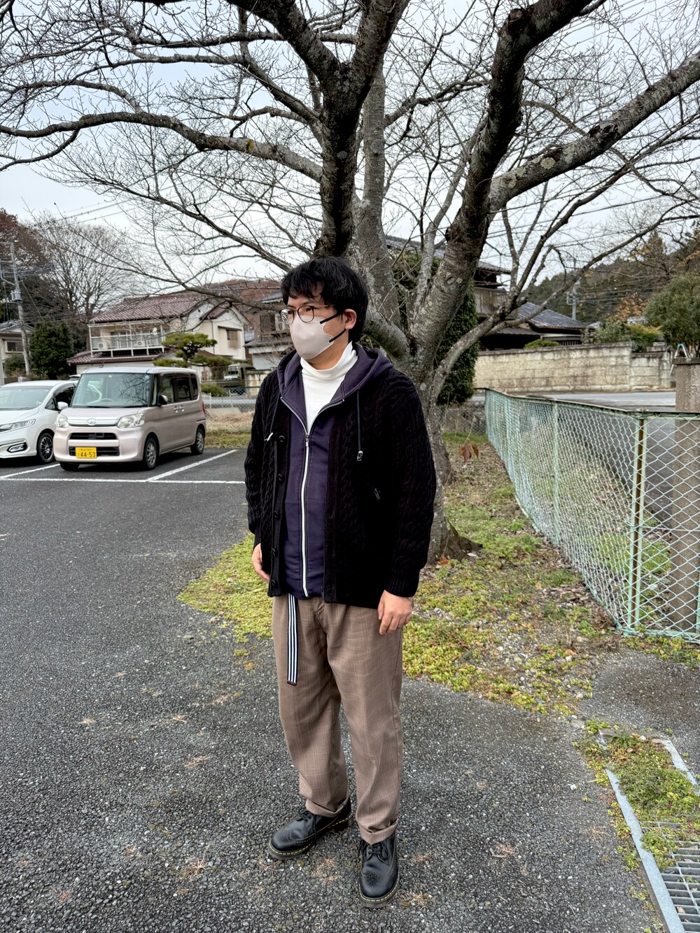 タートルネックの下にジップパーカーを重ね,その上からカーディガンで仕上げました。