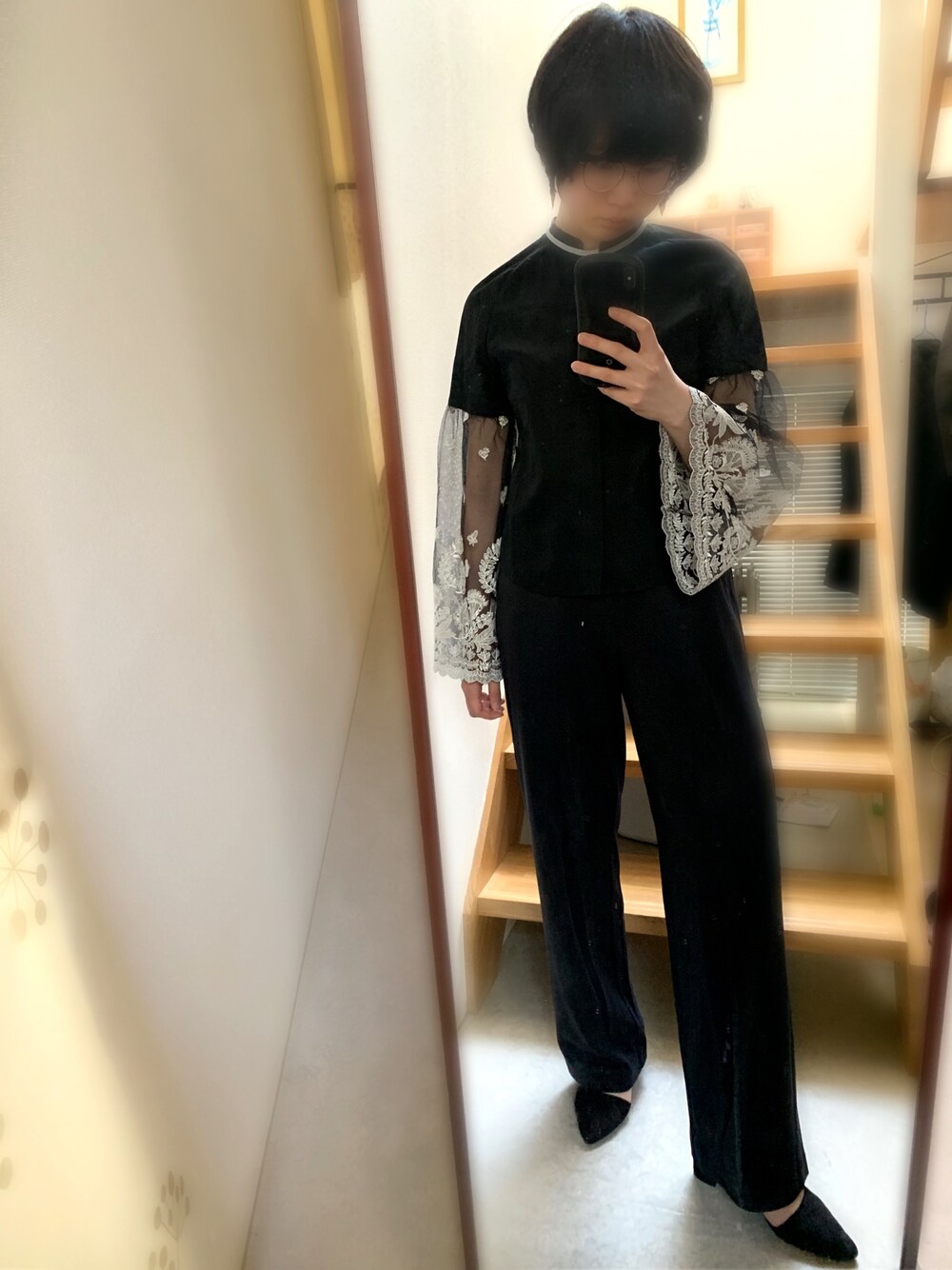 LOKITHOのブラウスの刺繍が繊細ですごくキレイで、袖が広がる感じが女性らしくて好き✨! 08sircusのパンツは、麻なので履き心地バツグン!そして、この形のキレイさ! 最高!!!!