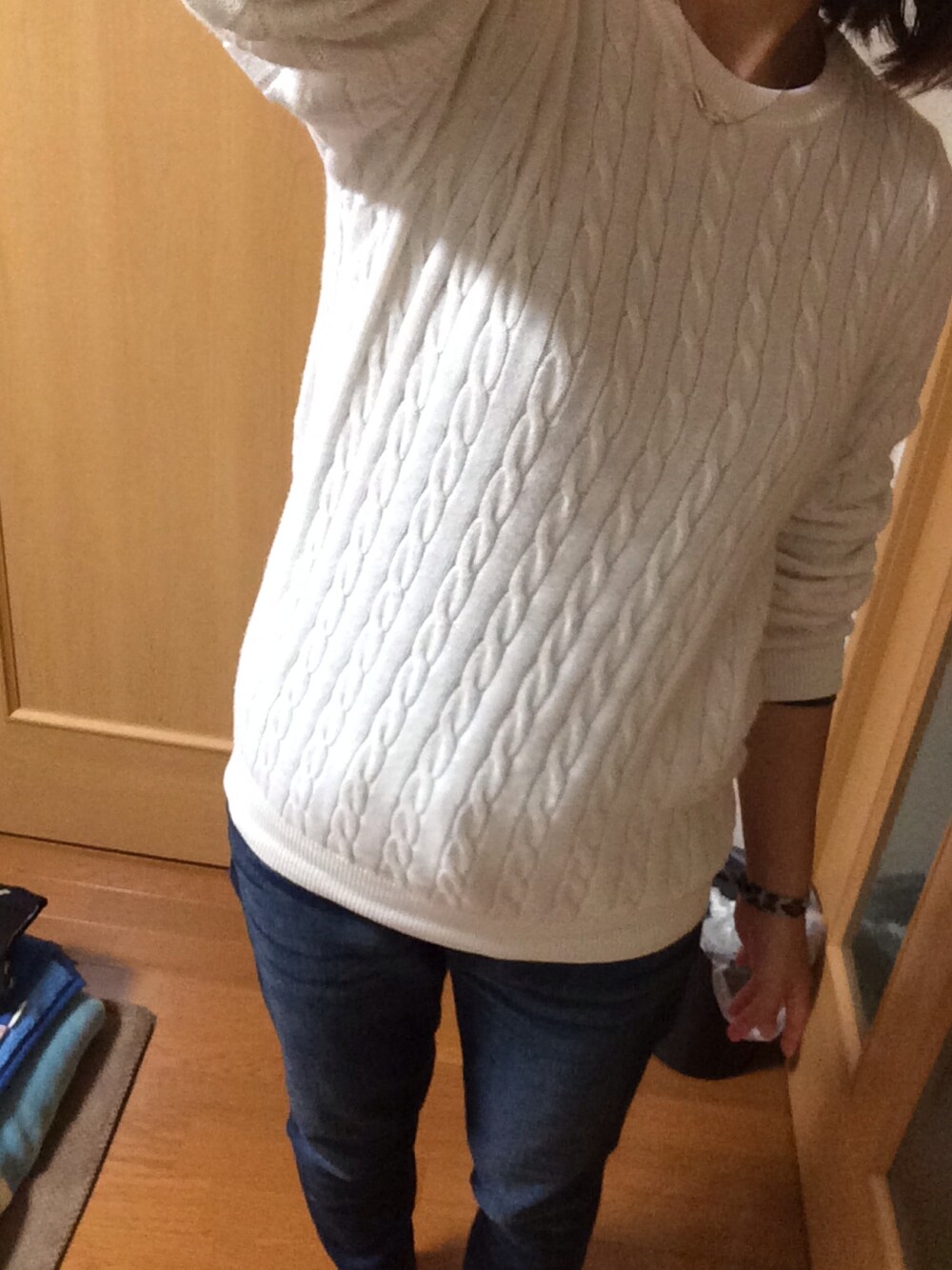 本日運動会スタイルで、デニムのラインはわかりずらいですが、ちょっとゆったりめのストレッチ効くやつです! トップスはメンズのほうのニットー。 秋晴れの天気で良かった!