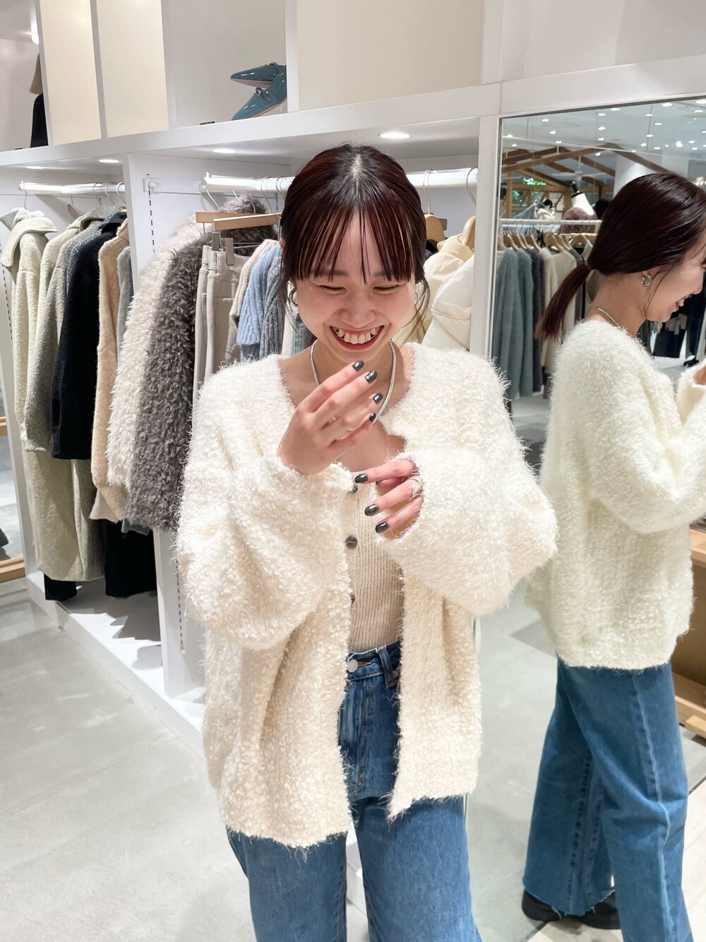 ○シャギーラメポップカーディガン ラメ感のあるニットです! もちもちの柔らかい素材です! カーディガンとしても、ホックを止めてニットとしても使っていただけます! ○カットオフフレアデニム サイズ②を着用しています! 柔らかい素材のデニムで履きやすいです! ハイウエストで美シルエットです♩