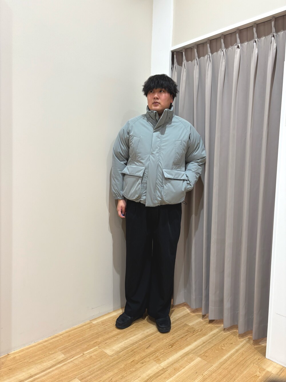 フードをとってスタンドカラージャケットとして着用しています!機能性中綿なのでダウンと遜色ない保温性があります!通気性も良いため雨や雪に強いのもありがたいです!