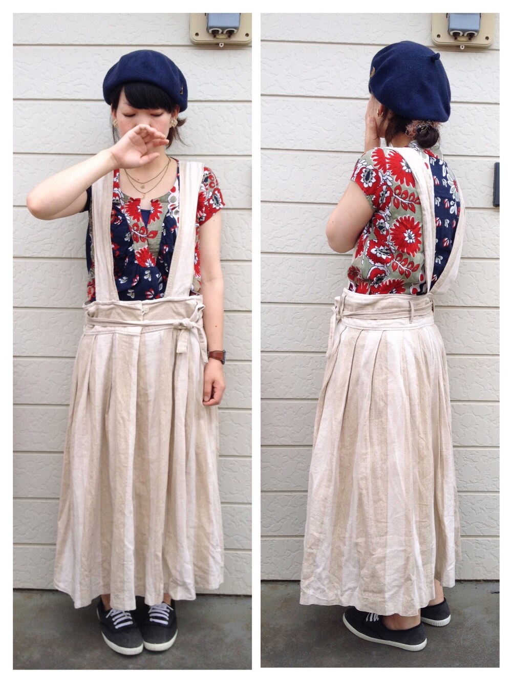 ベージュ系のスカートを着用したレディースの夏コーディネートの1枚目の写真