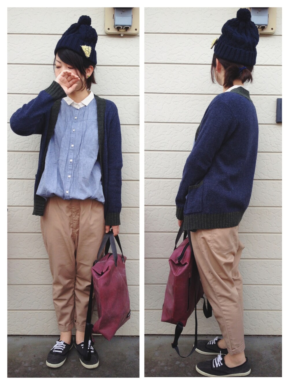パープル系のバックパック/リュック、グレー系のスニーカーを着用したレディースの秋コーディネートの1枚目の写真
