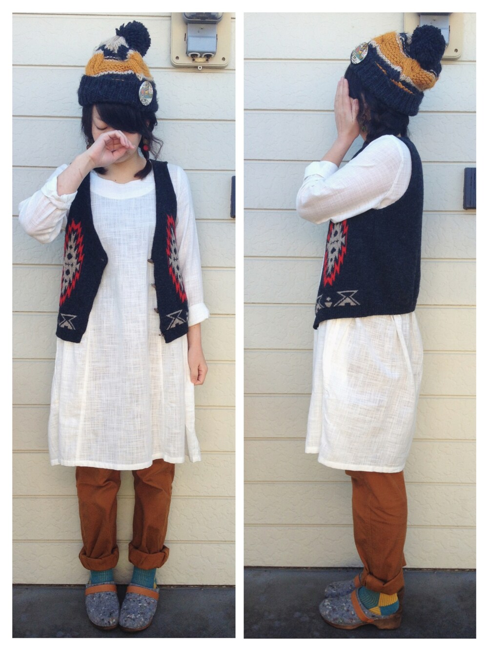 帽子 : しまむら ワンピース : しまむら ベスト : 戴き物 サボ : MOHEDA TOFFELN この上にカーディガン羽織りましたが 写真取るの忘れました