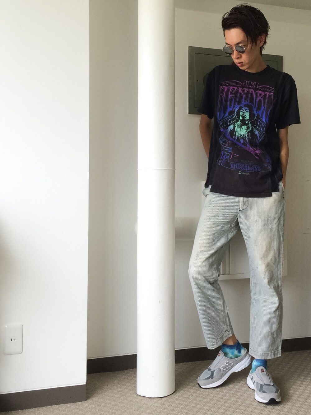 【サイケヒッピー】 カラーリングと汚なさね笑 ロックT:Rebuild by needles ボトムス:mean スリッポン:NEW BALANCE バッグ:Engineered Garments サングラス:GDC
