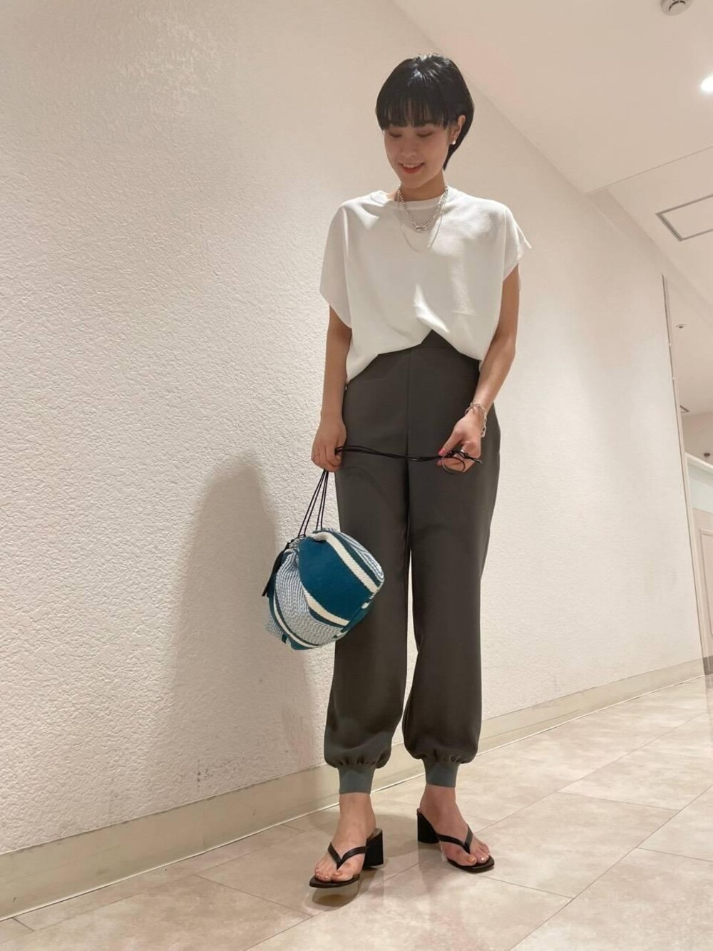 ・身長:161cm ・普段サイズ:トップスM/ボトムスSまたはM/シューズ23cm 【サイズ感】 ニット:フリー/やや大きめ パンツ:M/標準的 サンダル:36h/標準的 【コーディネートポイント】 おすすめのジョガーパンツを着用したく、パンツからコーディネートを考えました。 こちらのお仕事でも使いやすいようなキレイめなトップスで合わせても、 今年らしいシアーシャツや、カラフルなブラウスで合わせても可愛いです。 色合わせが落ち着いた雰囲気だったため、 ポイントにアクセサリーを重ね付けしました。 重ね付けや、単品で付けてもデザイン性があり、お洒落なアクセサリーが多数揃っています。 ぜひ、店頭でもご覧ください。