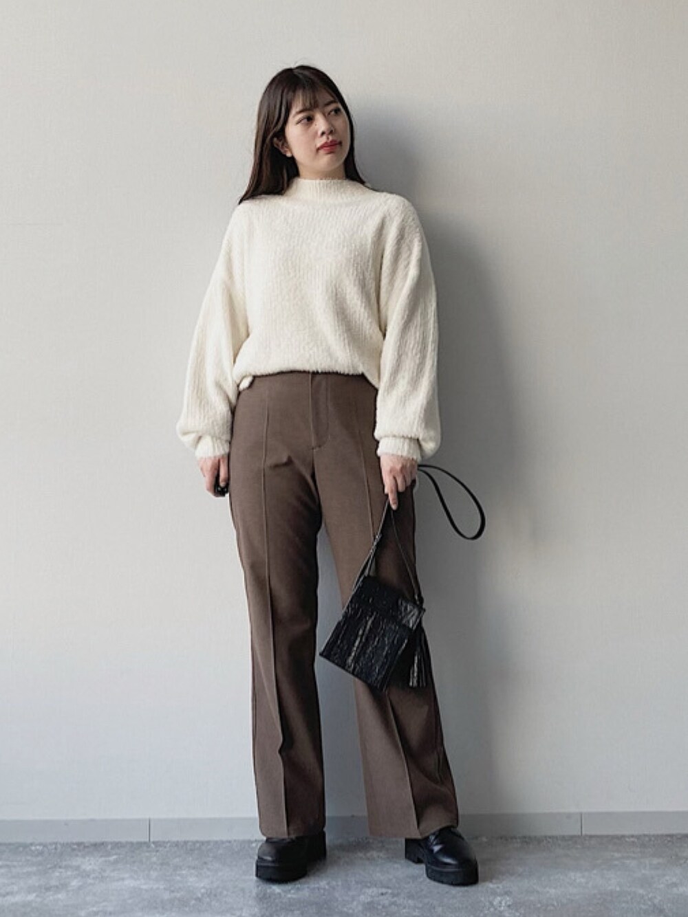 ふわふわのフェザーニット、 かわいくなりがちのホワイトは かっこよくブラウンパンツで合わせました。 カジュアル、シンプル好きな方に おすすめのコーデです❤︎