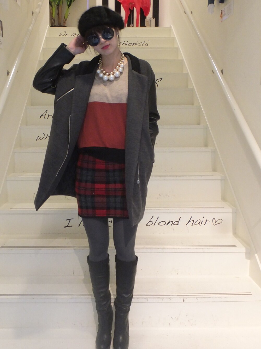 ロングスタジャン:GALLERIE チェックスカート:GALLERIE