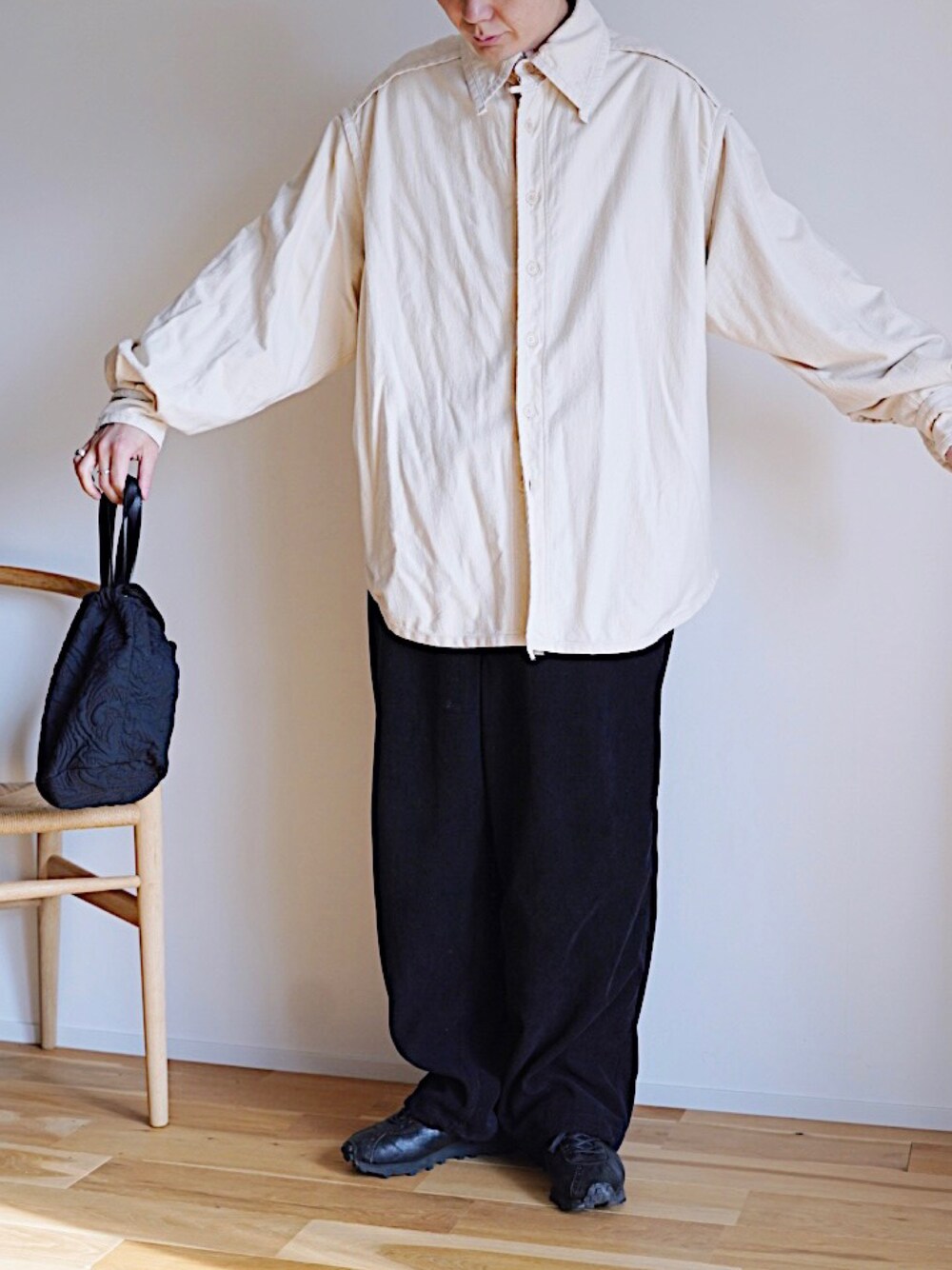 tac:tacの2022SSシャツがギャザーが入る感じに見えて、手首にボリュームが溜まってかわいすぎる、、 Shirts… #tac:tac Pants… #daiwapier39_official Shoes… #henderscheme Bag… #henderscheme