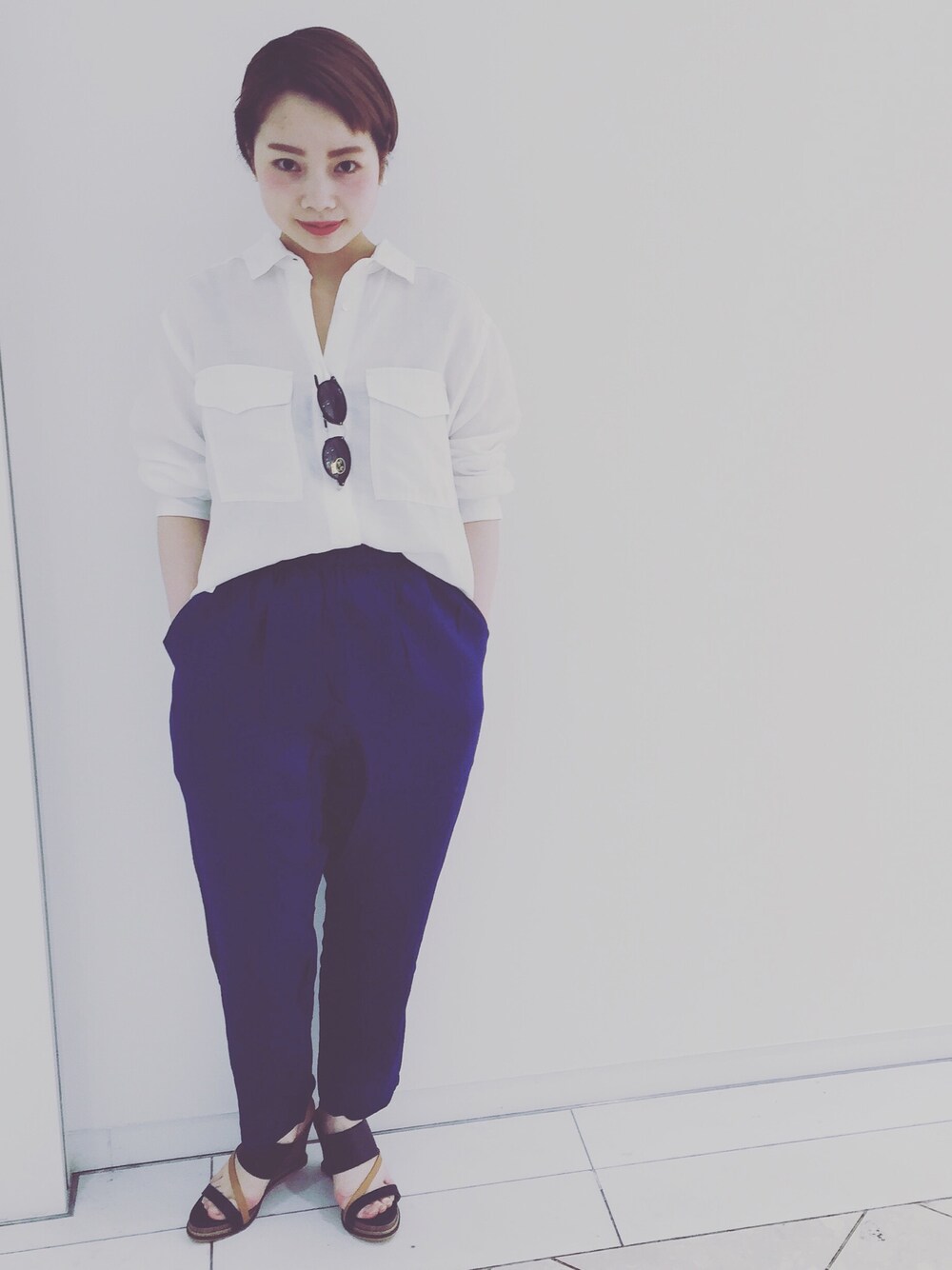 シンプルなシャツとGALLEGOのパンツを合わせ新鮮なクールコーデ。