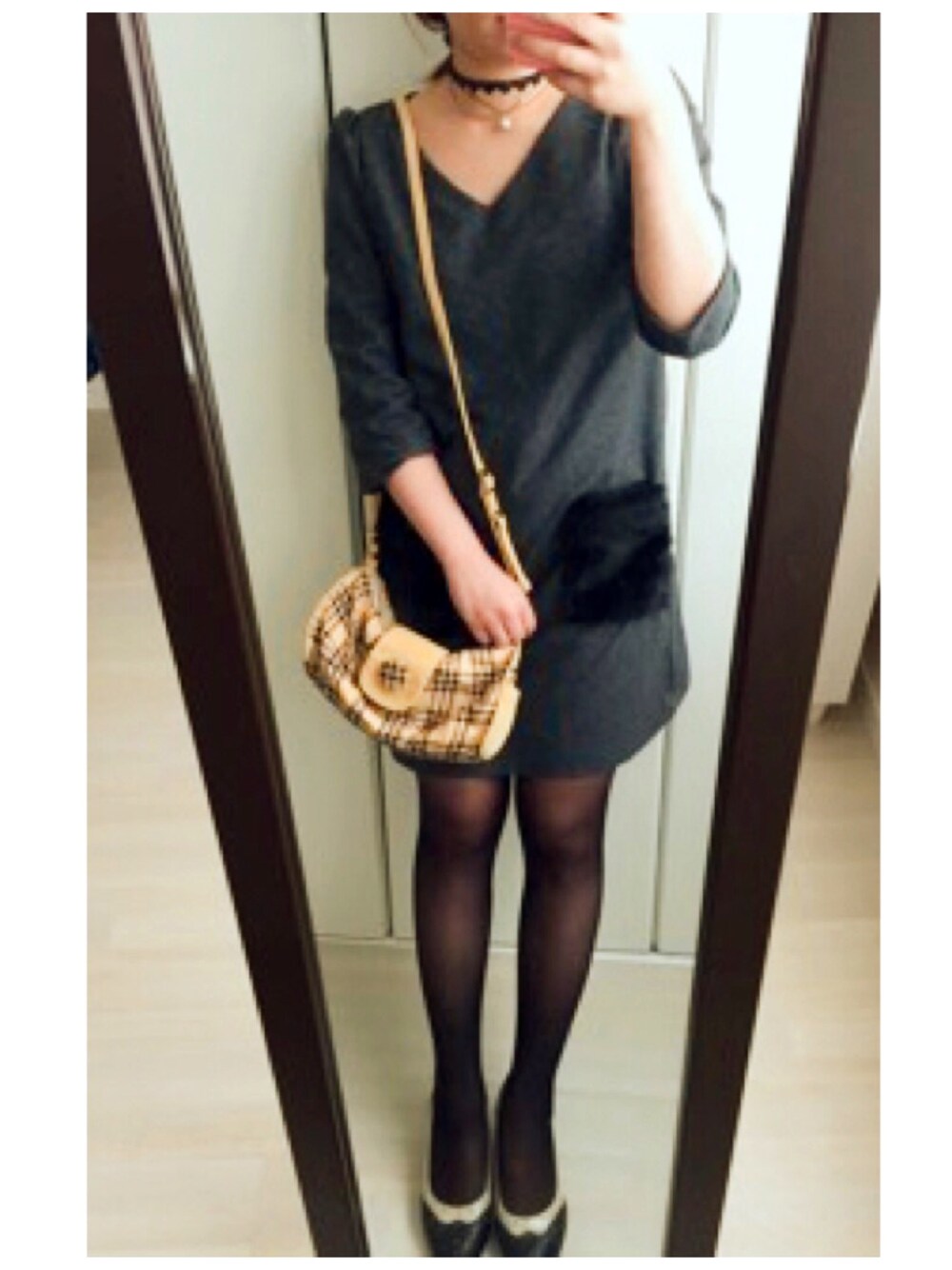 いちのワンピース「フェイクファーポケット5分袖サックワンピース」を使ったコーディネート