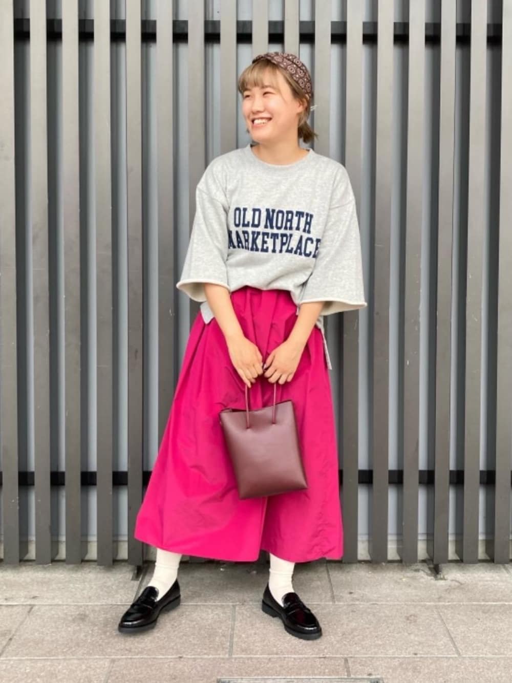 身長:162cm 普段サイズ:ボトムス38または40/シューズ23.5cm 【サイズ感】 トップス:ゆったりめ スカート:標準的 シューズ:標準的 【コーディネートポイント】 ボリュームたっぷりの着映えするスカートに敢えてスウェットを合わせて今年らしいスタイルに。 バッグをボルドーにしてスカートとグラデーションを作りました。