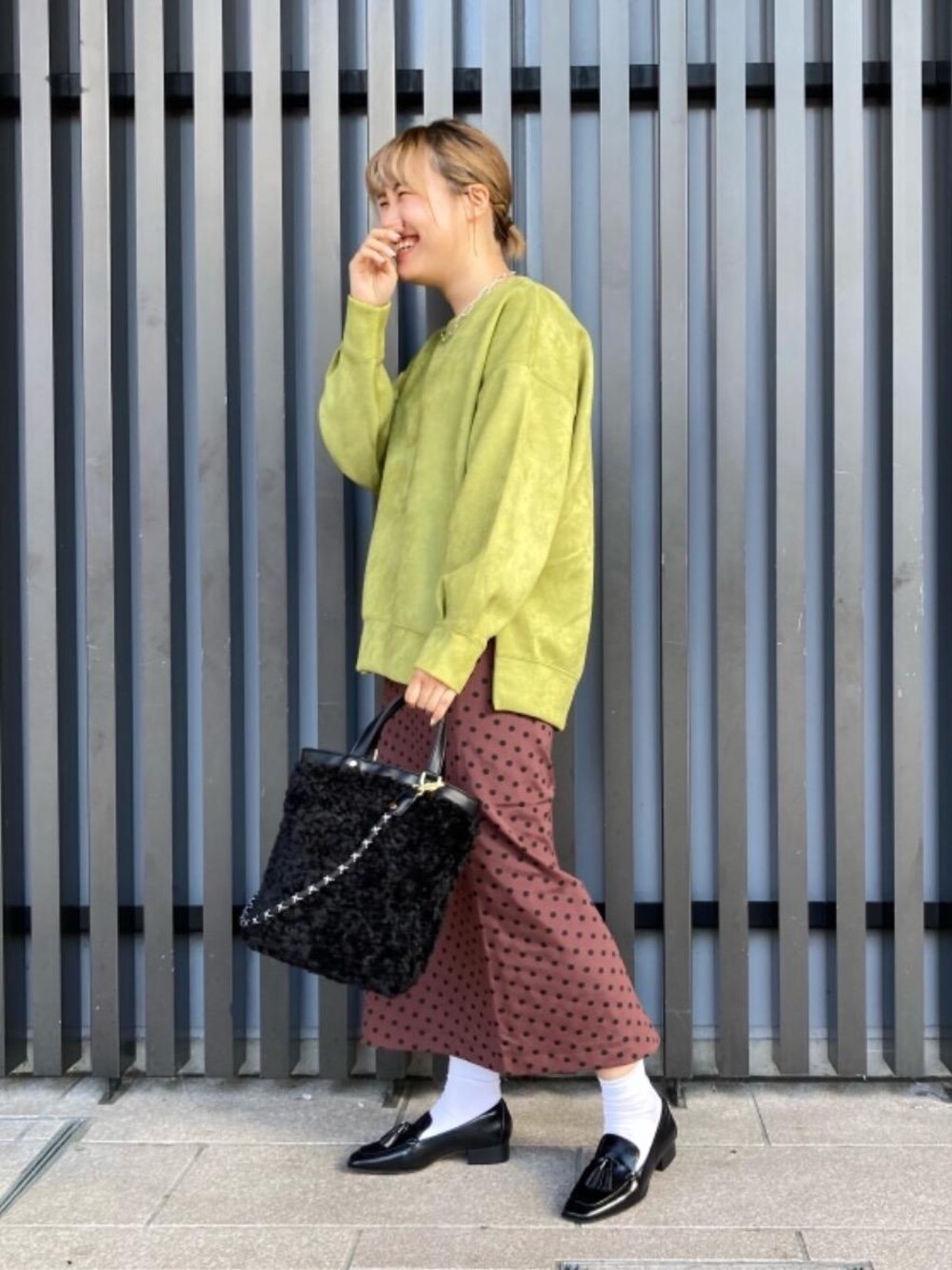 身長:162cm 普段サイズ:ボトムス38または40/シューズ23.5cm 【サイズ感】 トップス:ゆったりめ スカート:ややゆったりめ シューズ:標準的 【コーディネートポイント】 グリーン×ブラウンの組み合わせとアイテムの素材感で秋らしさを出しました。