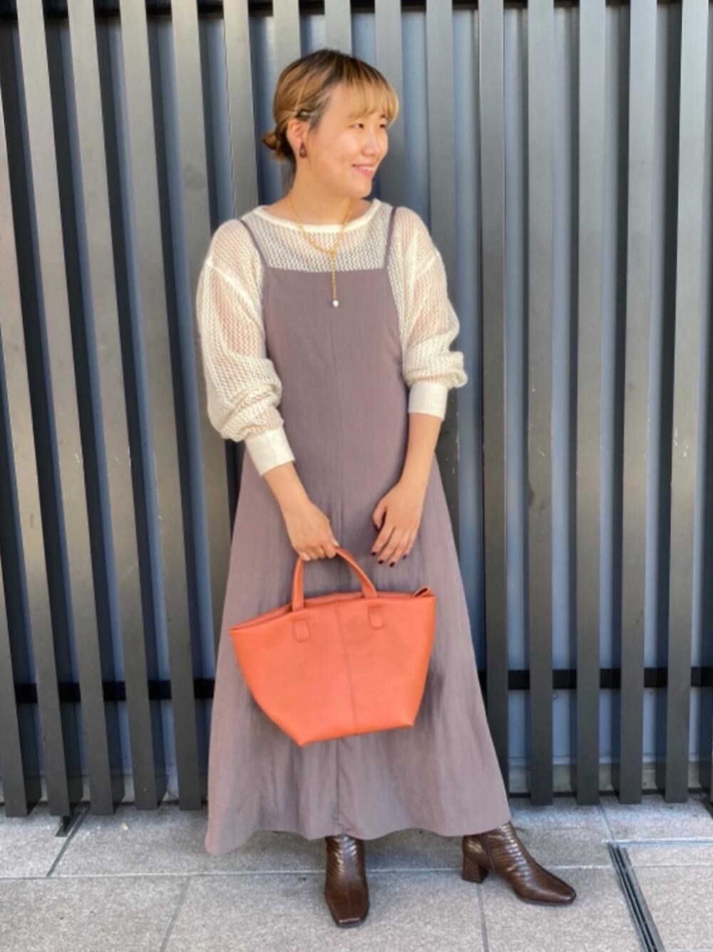 身長:162cm 普段サイズ:ボトムス38または40/シューズ23.5cm 【サイズ感】 ニット:腕周りゆったり ブーツ:標準的 【コーディネートポイント】 メッシュニットをキャミワンピのインナーにしてふんわり感を意識したスタイルにしました。 締め色を作りすぎず秋らしいカラー合わせがポイントです。