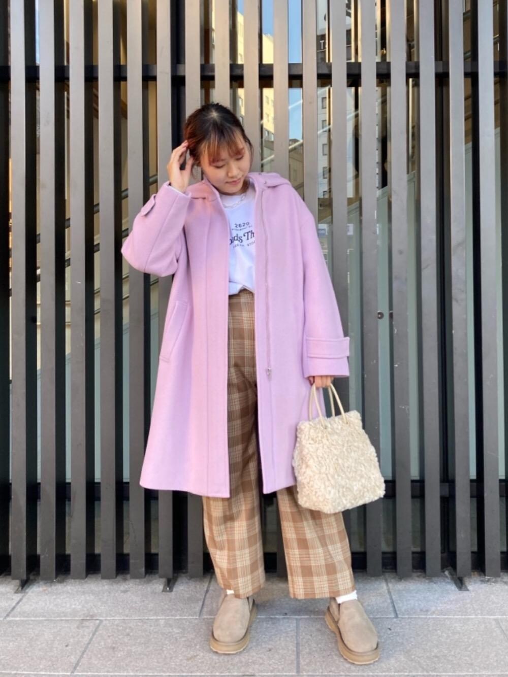 身長:162cm 普段サイズ:ボトムス38または40/シューズ23.5cm 【サイズ感】 アウター:標準 パンツ:ウエスト標準、太もも周りゆったり 【コーディネートポイント】 ライラックのコートを主役に、冬素材の小物と暖色合わせで可愛らしさのあるカジュアルなスタイルにしました。