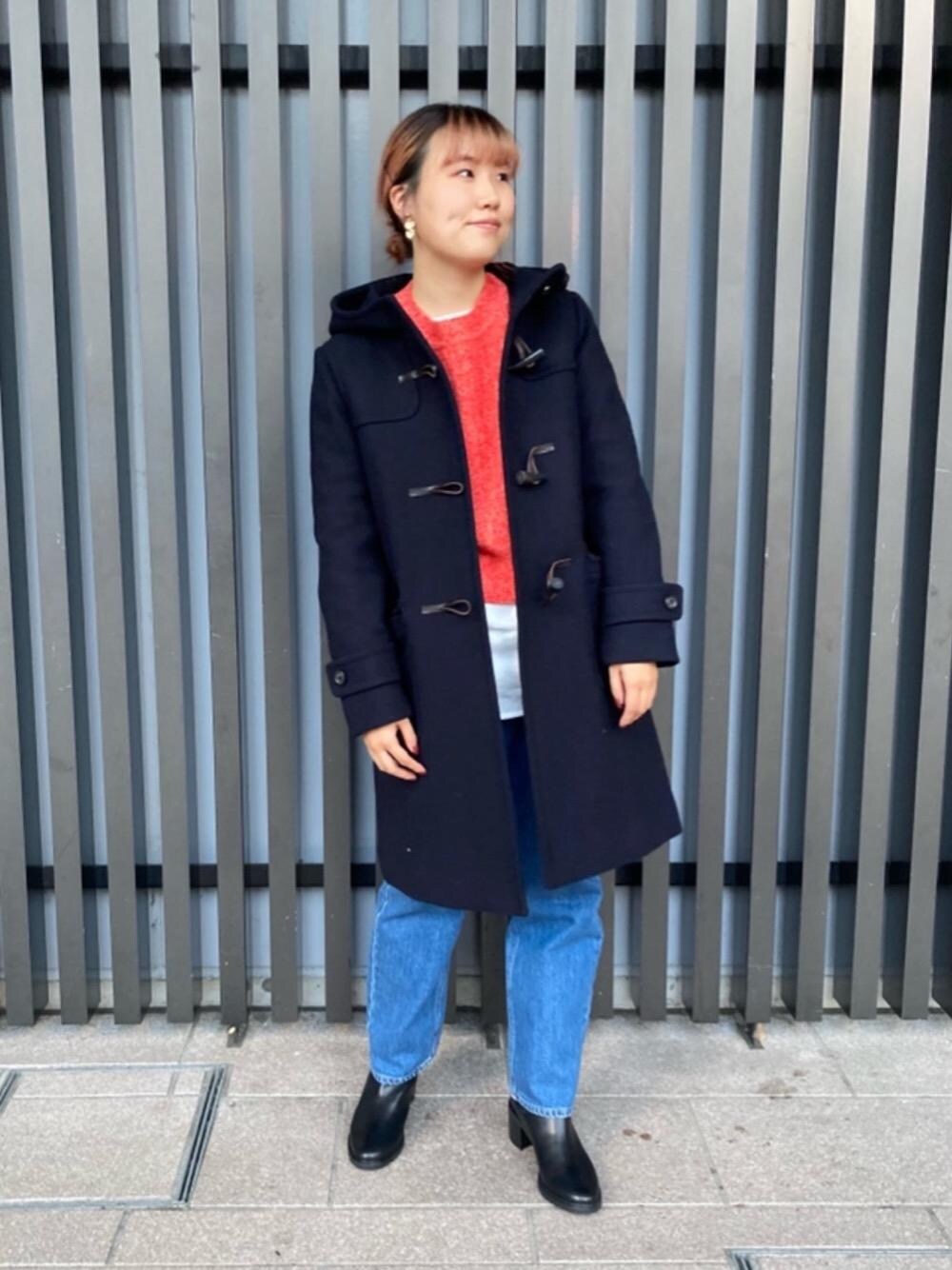 身長:162cm 普段サイズ:ボトムス38または40/シューズ23.5cm 【サイズ感】 アウター:標準 ニット:標準、袖ゆったり パンツ:ゆったり、丈長め 【コーディネートポイント】 ダッフルにデニムでスタンダードな雰囲気を出しつつ、ニットはクロップド丈でトレンドもプラスしました。 アウターを脱いでも、ニットの袖口がポイントになります♪