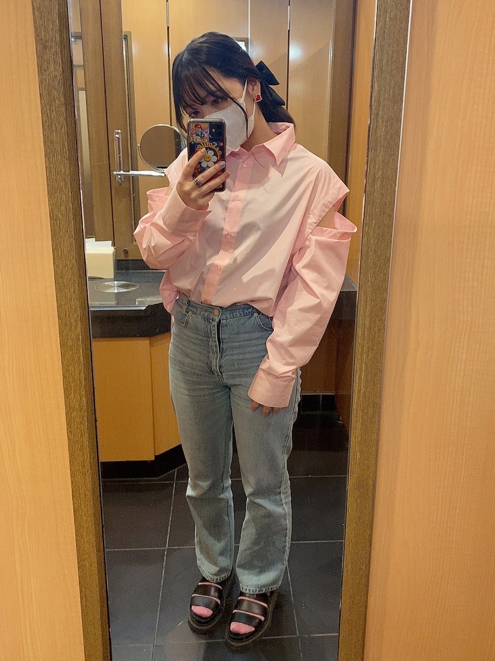 しまむらで見つけたピンクのシャツ🎟🎀 濃くもなく薄くもなく絶妙に丁度いい色を求めてた。。! 袖が取り外しできてベストにもなる!めちゃくちゃかわいくてお気に入りになった〜〜🧚‍♀️💫