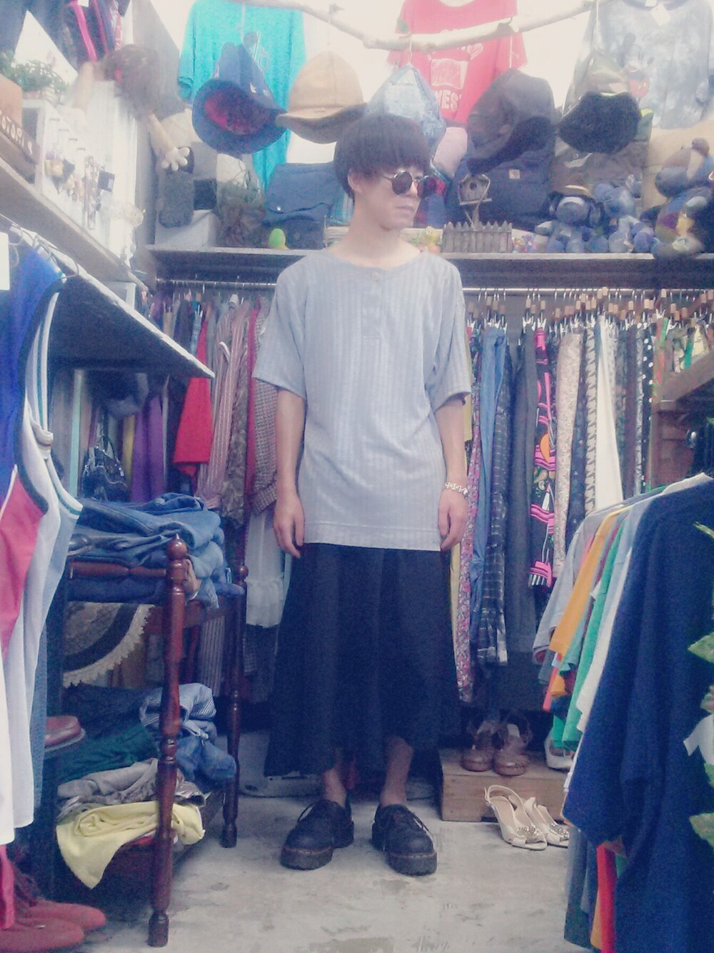 トップス/used パンツ/used シューズ/Dr.Martens 時計/GUCCI サングラス/used 盛岡はさんさ躍り三日目 撮影場所はレトロブティックことりです