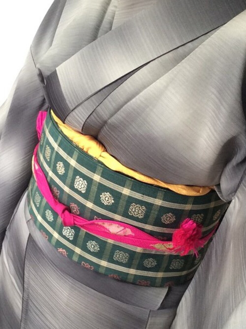グレー紬、黄色帯揚げ、グリーンに模様の帯、 ピンクの帯締め、以上すべてリサイクルにて。 追記:帯締めはアンティークのため短いが、 前から見た時一本に見えるよう重ねて始末するよう 実家の母のお世話になっている着物屋さんから ご指導あり。 自己流初心者のため、不細工でした。 ご指導ありがとうございます。