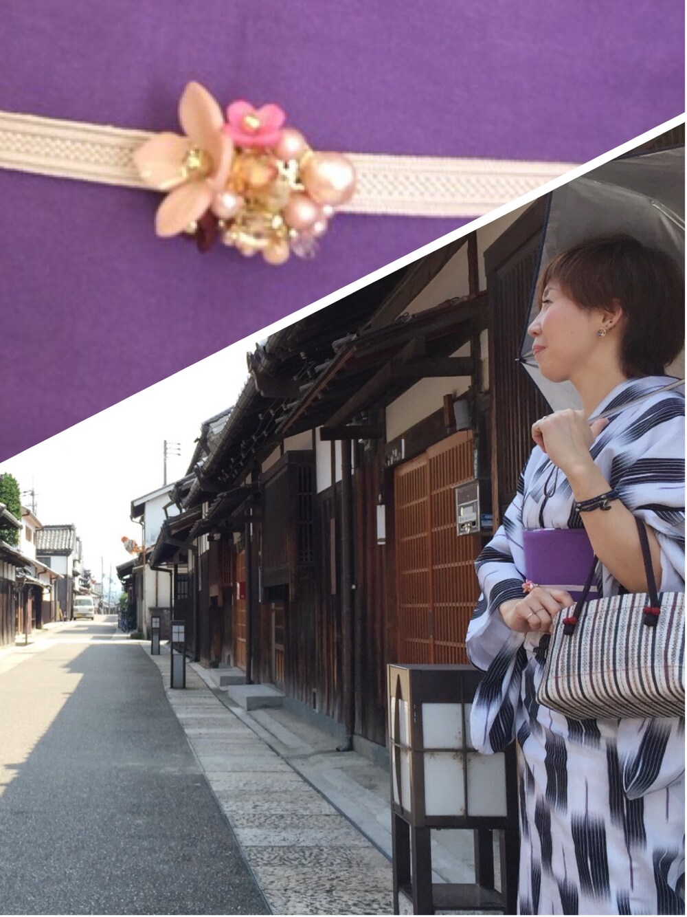 ゆかた、帯、手さげカバン、下駄もいつもと同じ。 帯締めと帯留めだけ変更。