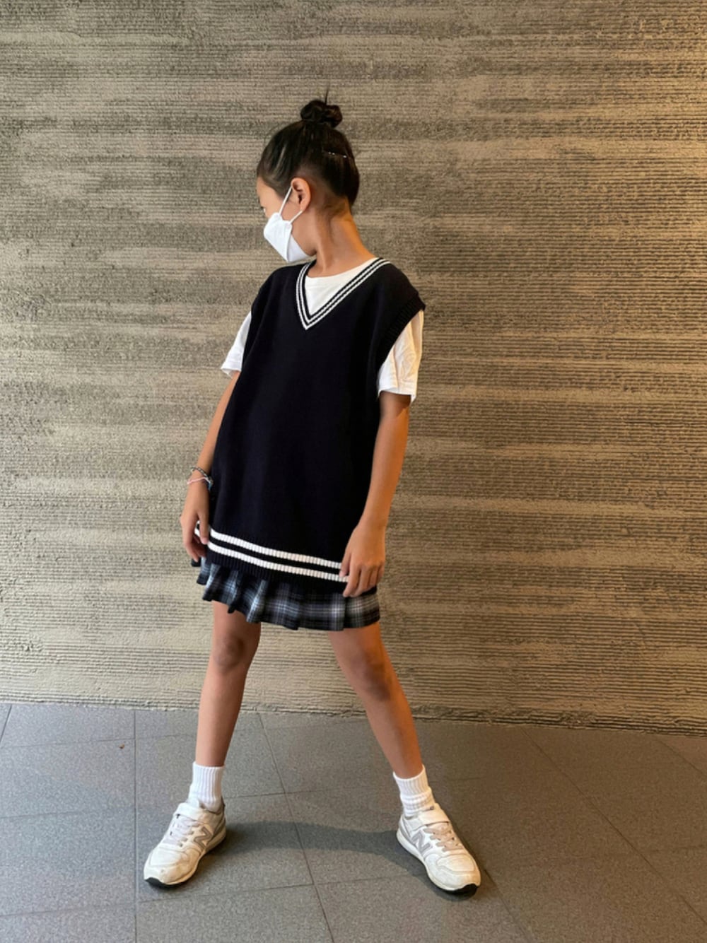 新学期! 制服風コーデをチョイスして気を引き締めてました。 ↑ 父にそっくりの形から入るタイプ…笑 前々から欲しいと言われていたスクールベストはなかなか好みのサイズ感のものが見つからず。nissenの150を注文してみたらちょうどいい感じ💜