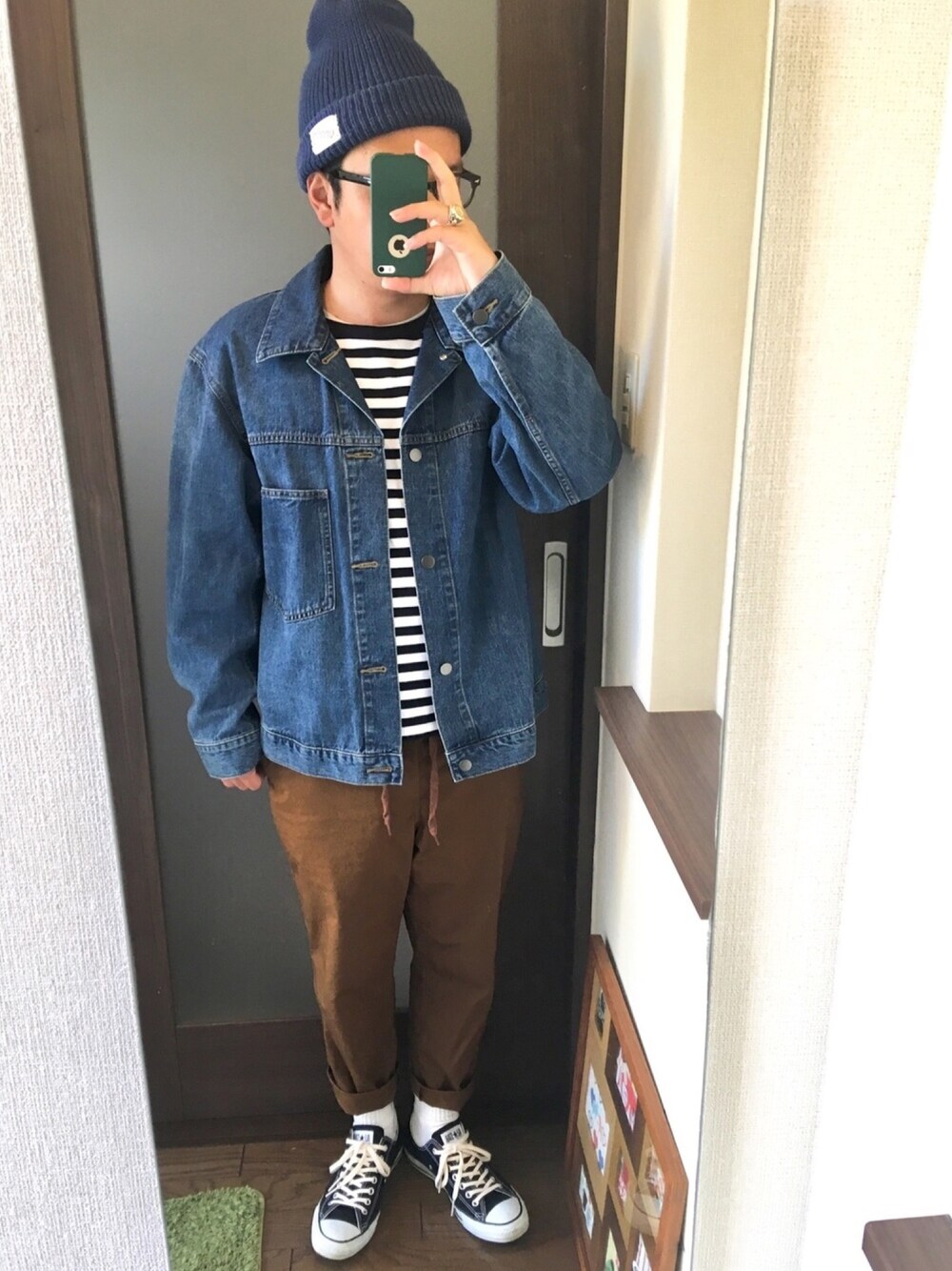 ZOZOボーダーネイビー。 ジャストでオーダーしていい感じの着用感だけど もう少し丈長い方が良かったな。 僕氏的にはGUのワッフルTで充分かも。 あとは耐久性。 愛読立ち読み本のレディースファッジの影響で 白靴下をルーズで履いてます。 いまいち伝わらず。