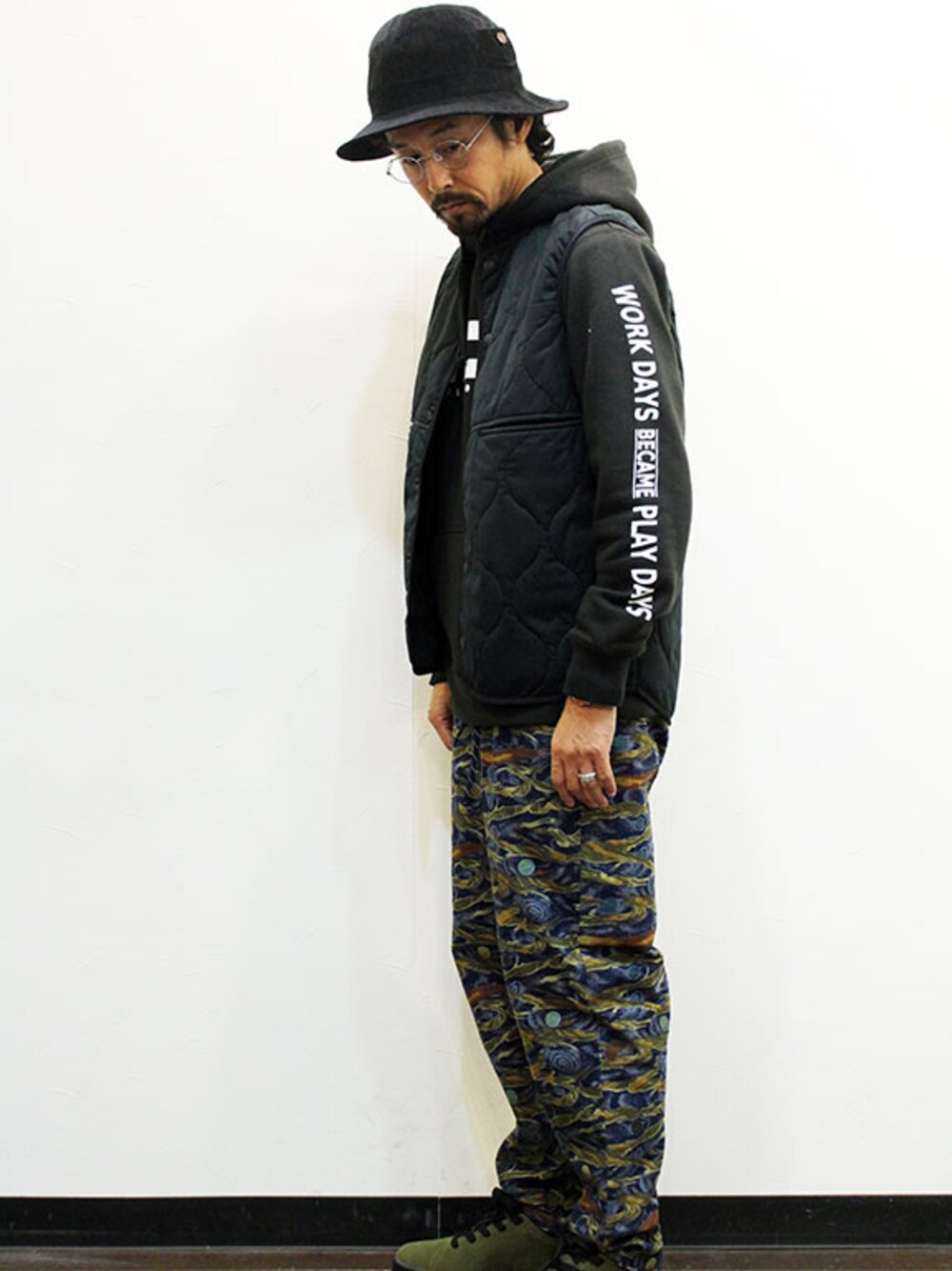 [モデル 168cm 54kg 足サイズ 26cm ] HAT : sleepslope (スリープスロープ) " Corduroy Metro Hat " VEST : SUNNY SPORTS (サニースポーツ) " LEVEL5 SOFT SHELL VEST " (サイズM着用) SWEAT : P01 (プレイ) " CF HOODED SWEAT " (サイズS着用) PANTS : ink (インク) Easy Pants " SPACE CAMO P " (サイズS着用) SHOES : AREth (アース) " Ⅰ lace " (サイズUS8着用)