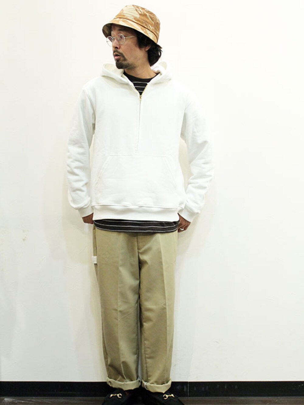 [モデル 168cm 54kg 足サイズ26cm ] HAT : THE COLOR (ザ・カラー) " BUCKET HAT " PARKA : THE FABRIC (ザ・ファブリック) " S/U PARKA " (サイズM着用) L/S TEE : Necessary or Unnecessary " BORDER L/S " (サイズL着用) PANTS : Hexico (ヘキシコ) " Deformer pants Quarter easy " Little pocket & loops (サイズ2着用) SHOES : MANEBU (マネブ) " BITCH " SUEDE (サイズ41着用)