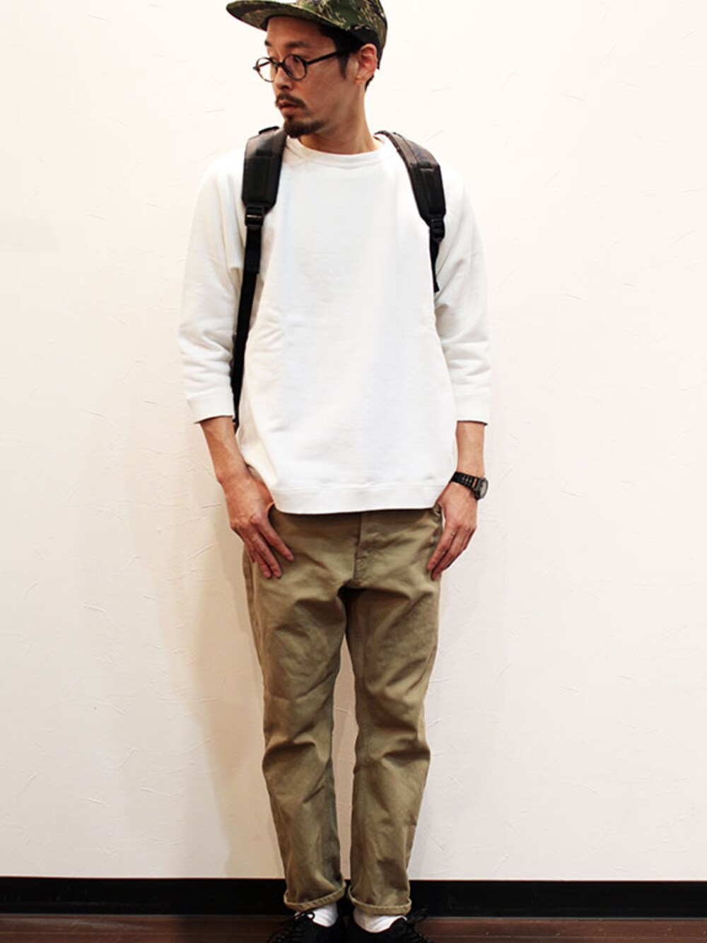 [モデル 168cm 54kg 足サイズ 26cm ] CAP : THE STAKE (ザ・ステイク) " 5 PANEL CAP " TIGER STRIPE PRODUCTS SWEAT : ISLAND KNIT WORKS (アイランドニットワークス) " Big SWEAT 8/s " (サイズ1着用) PANTS : melple (メイプル) M101 ピケクロップド (サイズS着用) SHOES : MANEBU (マネブ) " HIHIN " SUEDE (サイズ41着用) BAG : WONDER BAGGAGE (ワンダーバゲージ) " Goodmans daypack "