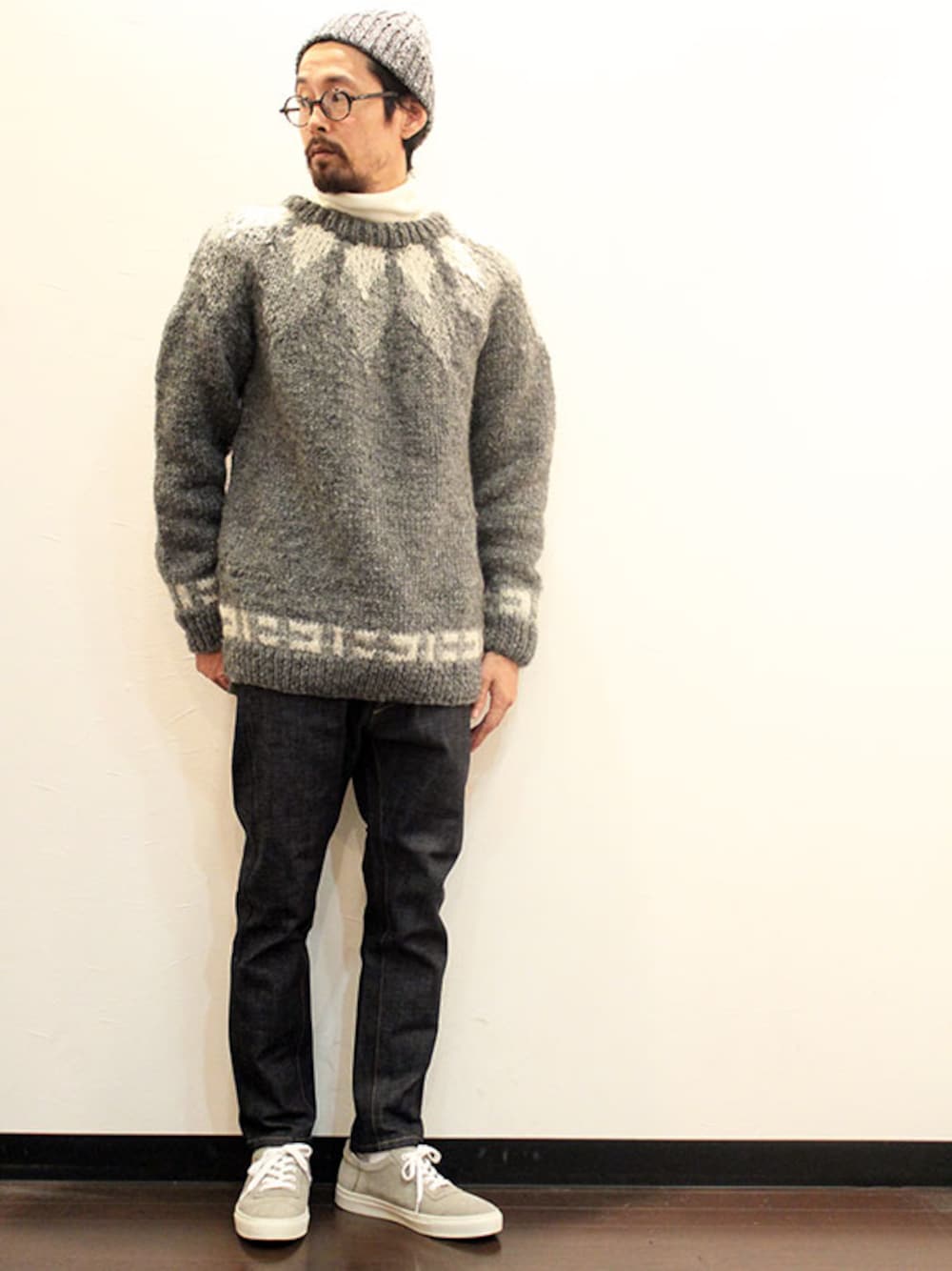 [モデル 168cm 54kg 足サイズ 26cm ] CAP : ISLAND KNIT WORKS (アイランドニットワークス) " All Cap " KNIT : THE FABRIC (ザ・ファブリック) " SUN KNIT " (サイズM着用) TURTLE NECK : SUNNY SPORTS (サニースポーツ) " turtle-neck " (サイズM着用) PANTS : MASACA (マサカ) " SELVEDGE DENIM PANTS " (サイズ1着用) SHOES : UNITED LOT. (ユナイテッドロット.) " AG Sneaker " Suede (サイズS着用)