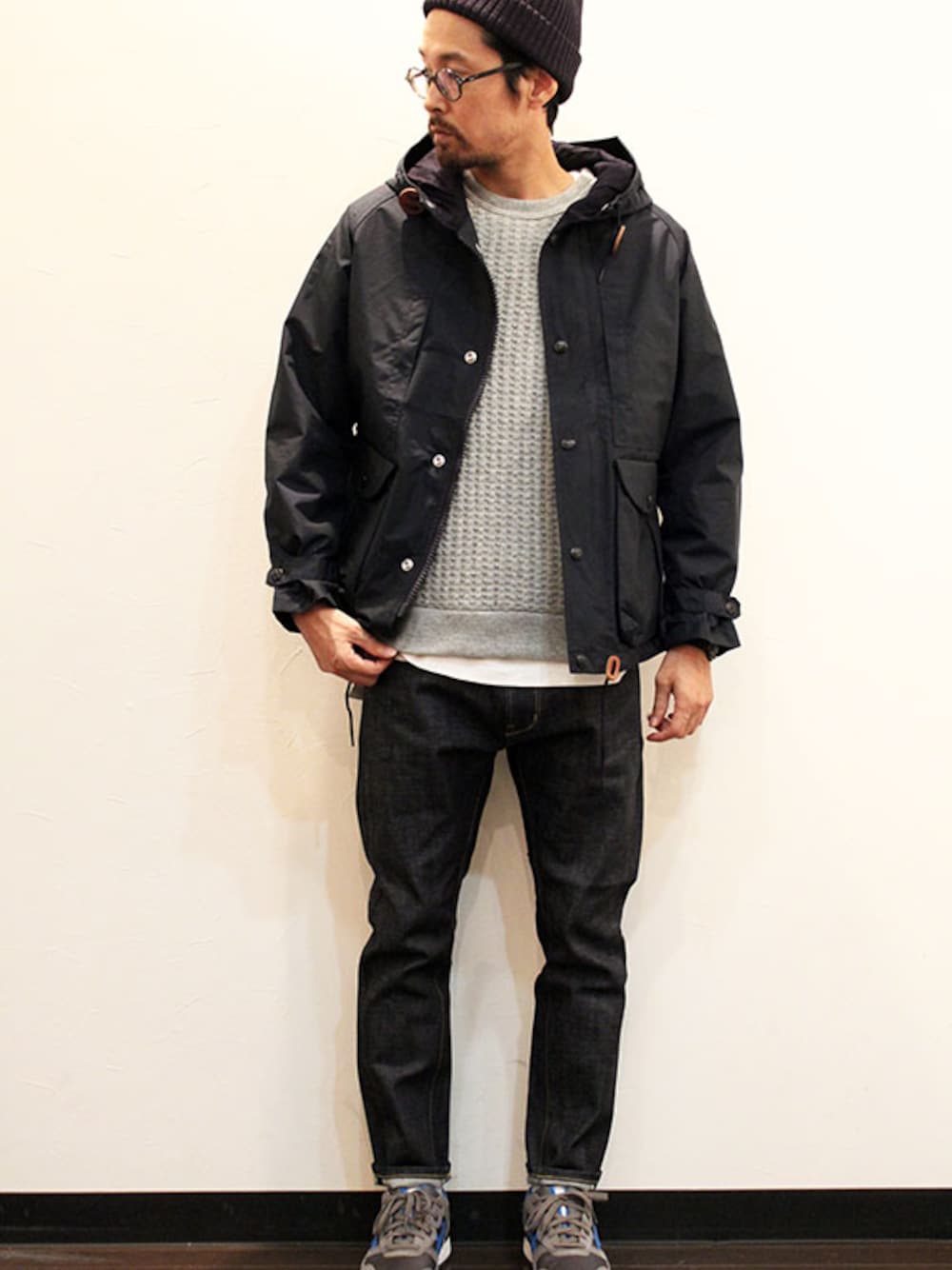 [モデル 168cm 54kg 足サイズ 26cm ] CAP : ISLAND KNIT WORKS (アイランドニットワークス) " Gima W Cap " JACKET : SUNNY SPORTS (サニースポーツ) " MOUNTAIN HOODY JK " (サイズS着用) KNIT : SUNNY SPORTS (サニースポーツ) " FREEDOM CREW NECK " (サイズS着用) PANTS : MASACA (マサカ) " SELVEDGE DENIM PANTS " (サイズ1着用) SHOES : ASICS " GEL LYTE 3 " (サイズUS8着用)