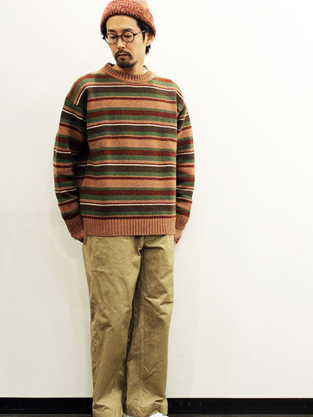 [モデル 168cm 54kg 足サイズ 26cm ] CAP : &. (アンド.) " MOHAIR Knit Cap " Exclusive KNIT : GOOFY CREATION (グーフィー クリエイション) " Lambs wool border knit " (サイズM着用) PANTS : Ordinary fits (オーディナリーフィッツ) " NEW PARK TROUSER " (サイズ0着用) SHOES : UNITED LOT. (ユナイテッドロット.) " AG Sneaker " Smooth Leather (サイズS着用)