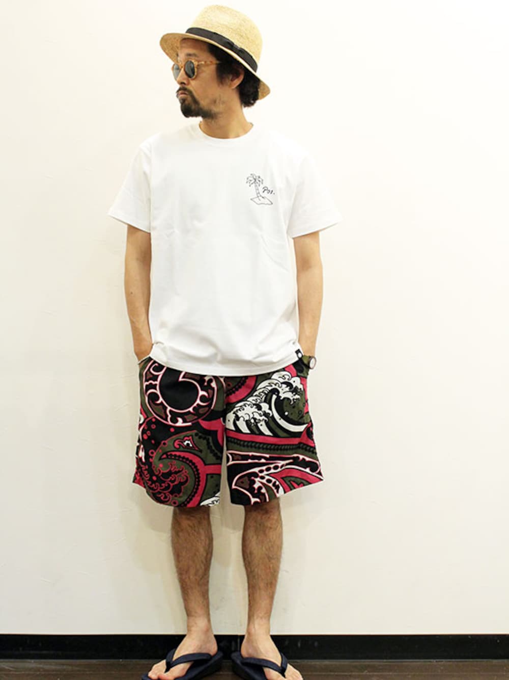 [モデル 168cm 54kg 足サイズ 26cm ] HAT : sleepslope " Rafia Hat " EYEWEAR : IZIPIZI " C " Sun TEE : P01 (プレイ) " MV TEE " (サイズM着用) SHORTS : HURRAY HURRAY (フレイ フレイ) " JAPANESE PAISLEY EASY SHORTS " (サイズ0着用) SANDAL : THE COLOR (ザ・カラー) " Snow Sandals " (サイズL着用)