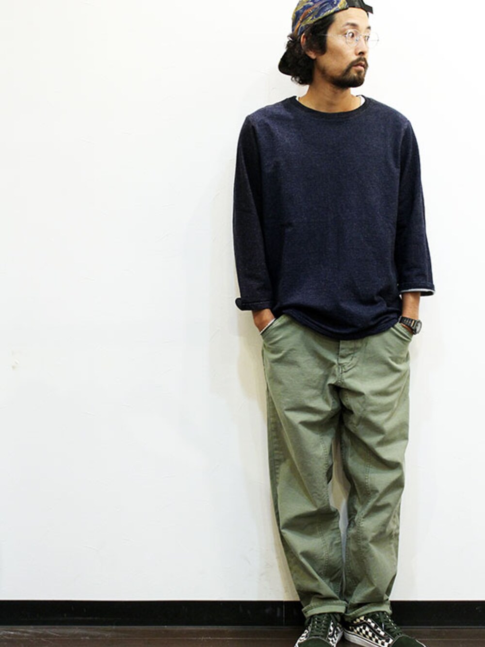 [モデル 168cm 54kg 足サイズ26cm ] CAP : ink (インク) JET Cap " SPACE CAMO C " CUTSEW : THE WOOOPS (ザ・ウープス) " INDIGO CUTSEW " (サイズM着用) PANTS : Ordinary fits (オーディナリーフィッツ) " SNAPPY BAKER PANTS back satin " (サイズ2着用) SHOES : Vans " Old Skool 50th " (サイズ27cm着用)