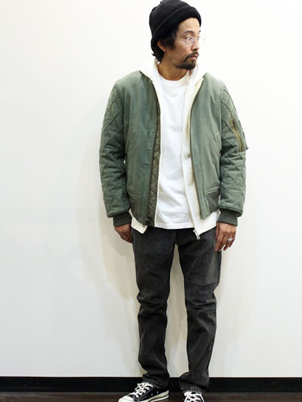 [モデル 168cm 54kg 足サイズ 26cm ] CAP : THE COLOR (ザ・カラー) " PK Cap " JACKET : ink (インク) Military Reversible MA-1 " SNAKE " (サイズM着用) PARKA : Soglia (ソリア) " DOLL Cardigan " (サイズM着用) L/S TEE : LIXTICK (リックスティック) " LIXTICK x KANTO Exclusive L/S " (サイズM着用) PANTS : ink (インク) 505 Denim Pants " THE CLASH " (サイズM着用) SHOES : CONVERSE " CTAS 70 OX " (サイズ26cm着用)