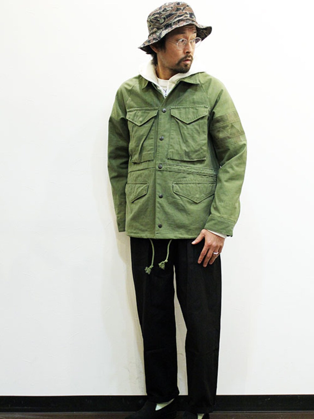 [モデル 168cm 54kg 足サイズ26cm ] HAT : ink (インク) Atomic Tiger Bucket Hat " Atomic Hat " JACKET : ink (インク) Coach Jacket " MILITARY TRIBE " (サイズM着用) PARKA : August Roots (オウガストルーツ) " Classic Zip Parka " (サイズ1着用) PANTS : COOCHUCAMP (クーチューキャンプ) " Happy Wide Tuck Pants " (サイズS着用) SHOES : MANEBU (マネブ) " HEEHAW " SUEDE (サイズ41着用)
