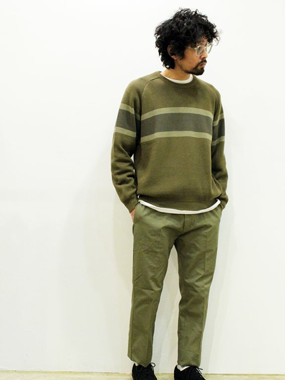 [モデル 168cm 54kg 足サイズ26cm ] TOPS : THE FABRIC (ザ・ファブリック) " LINE SWEATER " (サイズM着用) PANTS : Necessary or Unnecessary " JFK " (サイズ30インチ着用) SHOES : MANEBU (マネブ) " SYAVO " SUEDE (サイズ40着用)