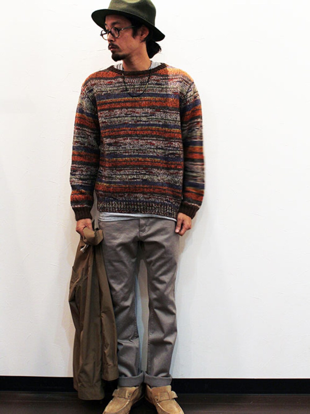 [モデル 168cm 54kg 足サイズ 26cm ] HAT : Nasngwam (ナスングワム) ” ROOSEVELT ” HAT KNIT : Soglia (ソリア) " Opal Sweater " (サイズM着用) PANTS : HEALTH (ヘルス) " Comfort slim pants " (サイズS着用) SHOES : Lot. (ロット) " Ring Moccasin " (サイズS着用) SHIRT : HEALTH (ヘルス) " Coach Shirts " (サイズS着用) NECKLACE : NL (ニール) " Amos "