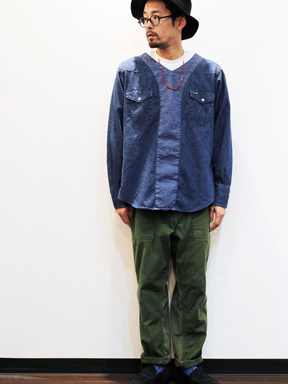 HAT : Nasngwam (ナスングアム) " ROOSEVELT HAT " NECKLASE : NL (ニール) " Amos " SHIRT : HURRAY HURRAY (フレイ フレイ) composition " Remake P/O Western Shirts "(サイズF着用) PANTS : Hexico (ヘキシコ) " Deformer front to back 2-u.s. Army jungle fatigue pants " (サイズM着用) SHOES : MANEBU (マネブ) " VOVO " SUEDE (サイズ41着用)