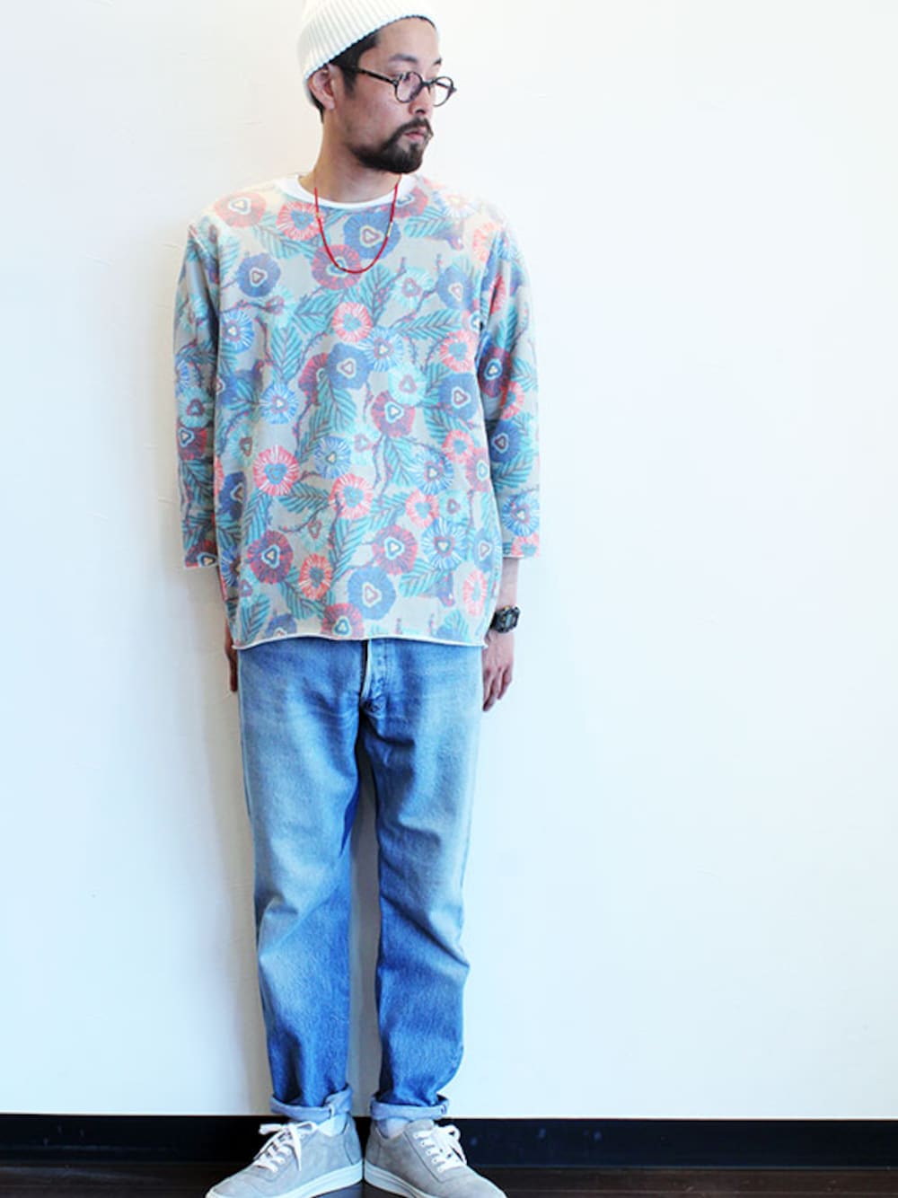 [モデル 168cm 54kg 足サイズ 26cm ] CAP : INFIELDER DESIGN (インフィールダーデザイン) " LINEN KNIT CAP " NECKLACE : NL (ニール) " Amos " SWEAT : miraco (ミラコ) " Deja vu " Sweat (サイズM着用) PANTS : Hexico (ヘキシコ) " Deformer pants tapered indigo rib " (サイズ33インチ着用) SHOES : UNITED LOT. (ユナイテッドロット.) " AG Sneaker " Suede (サイズS着用)