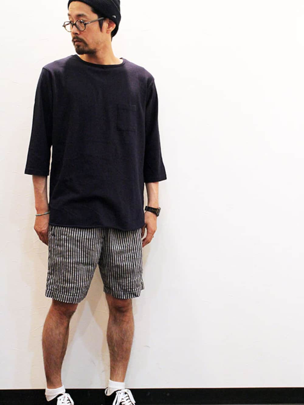 [モデル 168cm 54kg 足サイズ 26cm ] CAP : THE COLOR (ザ・カラー) " THE INDIGO WATCH CAP " TEE : MANUAL ALPHABET (マニュアル アルファベット) O/D 3/4 BIG TEE (サイズ2着用) SHORTS : Ordinary fits (オーディナリーフィッツ) " EASY SHORTS " linen (サイズ1着用) SHOES : UNITED LOT. (ユナイテッド ロット.) " Cap Toe Sneaker " Suede (サイズS着用)