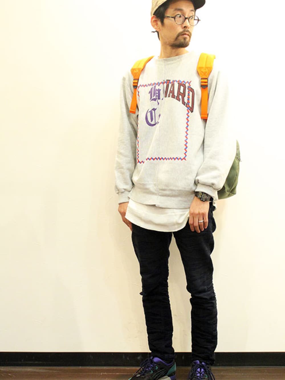 [モデル 168cm 54kg 足サイズ 26cm ] CAP : THE COLOR (ザ・カラー) " JET CAP " (MASAGON ver) SWEAT : HURRAY HURRAY (フレイ フレイ) composition " COMBINATION SWEAT " (サイズF着用) THERMAL : HURRAY HURRAY (フレイ フレイ) composition " THERMAL PATCHWORK " L/S T-Shirts (サイズ1着用) PANTS : ink (インク) 5P Tiger camo Pants " Diamond " (サイズS着用) SHOES : ASICS " GEL LYTE 3 " BAG : THE COLOR (ザ・カラー) " ONIGIRI BAG "