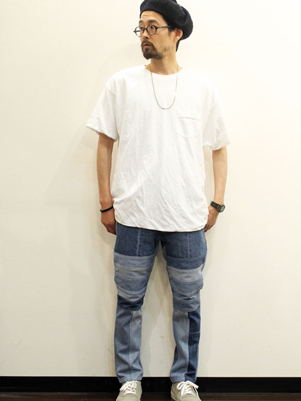 [モデル 168cm 54kg 足サイズ 26cm ] CAP : ISLAND KNIT WORKS (アイランドニットワークス) " De La - L " NECKLACE : NL (ニール) " Finis " TEE : Hexico (ヘキシコ) " DEFORMER EX, 2-HANES " (サイズL着用) PANTS : iHURRAY HURRAY (フレイ フレイ) composition " PATCH-WORK FLARE DENIM PANTS " (サイズM着用) SHOES : UNITED LOT. (ユナイテッドロット.) " AG Sneaker " Suede BANGLE : NL (ニール) " Rovert "