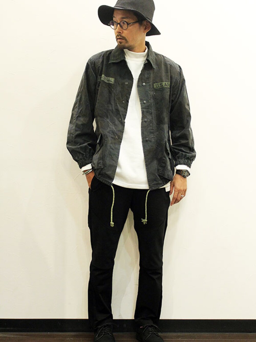 [モデル 168cm 54kg 足サイズ 26cm ] HAT : sleepslope (スリープスロープ)" Wide Brim Hat " JACKET : Hexico (ヘキシコ) " DEFORMER COACH JACKET " OVERDYE (サイズM着用) INNER : LOCALINA-MERIYASU-(ロカリナ-メリヤス) " MOCK NECK TEE " (サイズ1着用) PANTS : HURRAY HURRAY (フレイ フレイ) " JERSEY COMBINATION FLARE PANTS " (サイズ1着用) SHOES : MANEBU (マネブ) " HIHIN " SUEDE (サイズ41着用)