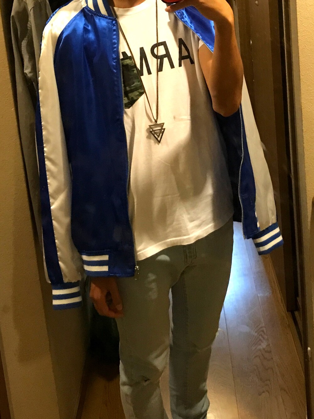 、、、とにかくカジュアルになりました。 このコーデだと靴は革靴がほんとにオススメです🤚 Tシャツの丈がスカジャンの丈よりも短かったので肩にかけました🙂🙃