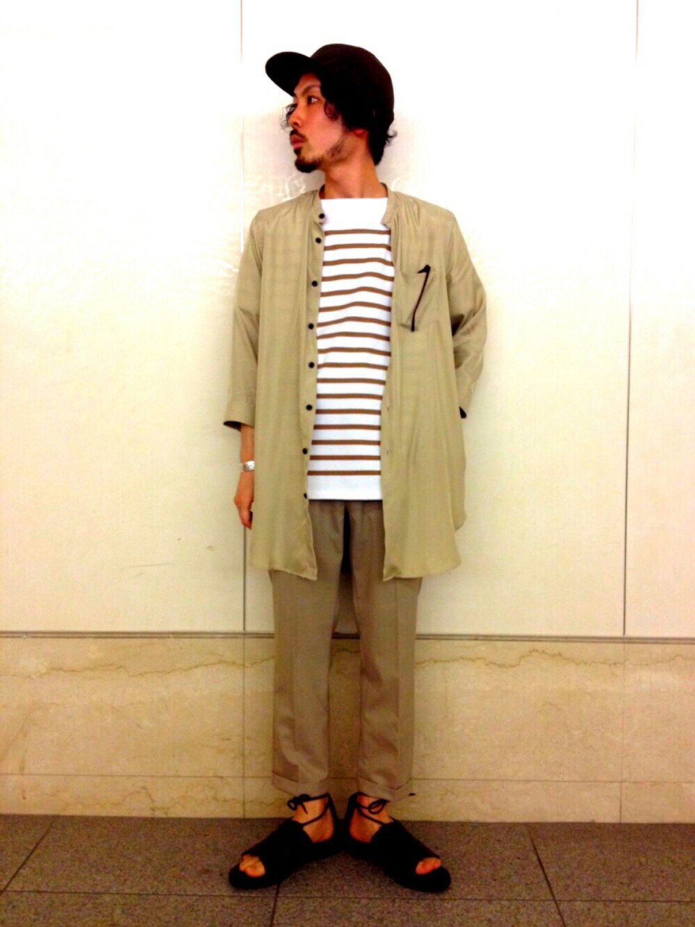 旬のベージュでまとめたスタイリングです。 ボーダーとサンダルで季節感をプラスしました。