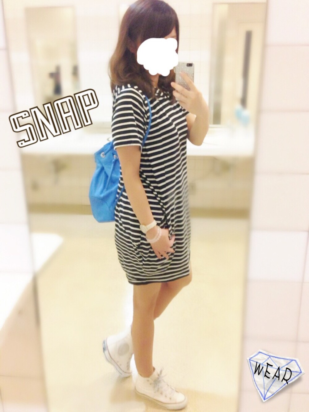 ボーダーが好きすぎる♡ このワンピースの形に一目惚れ♡ 最近ハマってるブルーを合わせて、 足元はコンバースでラフカジ?♡