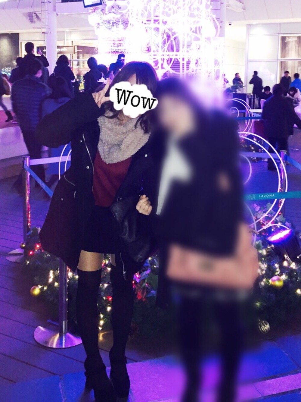 クリスマスを意識して赤ワンピ♡ 気合でニーハイソックス、寒かった(笑) 見た目寒くならないように 茶色のスヌードで暖かく♡♡