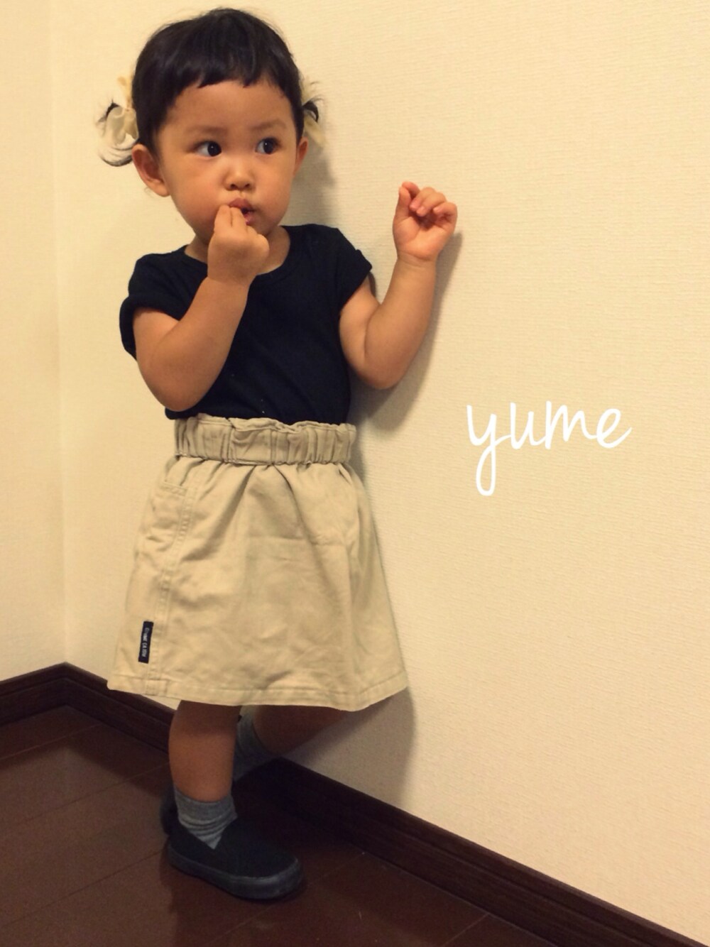 黒×ベージュ🙌 お下がりのコムサのスカート 100はまだまだおっきいな😧