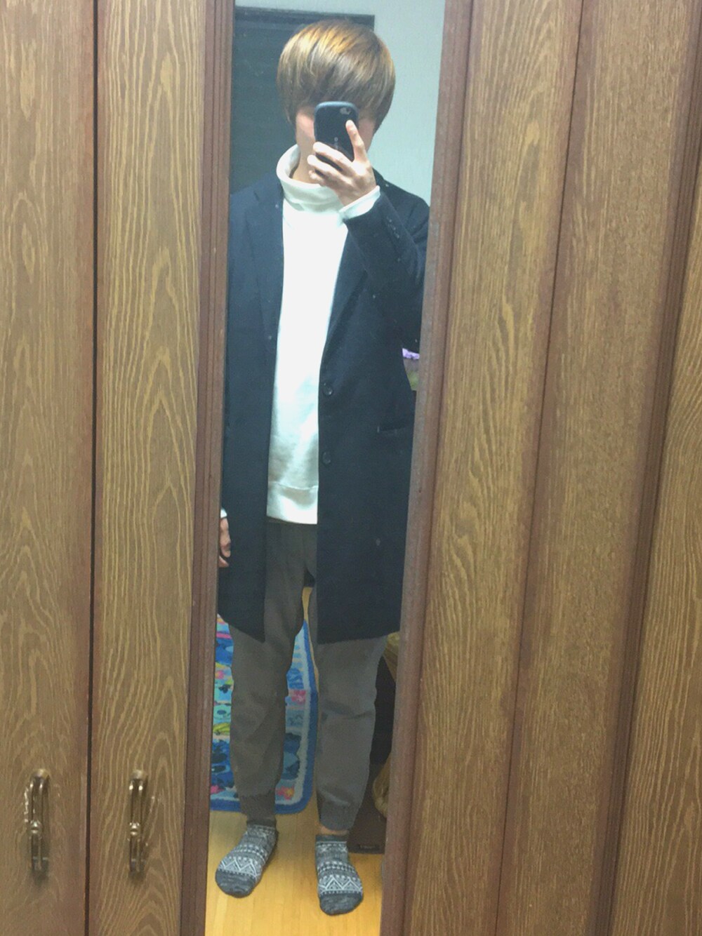 ネイビーのチェスターコートにグレーのジョガーパンツで合わせました! 中にスウェット生地の少しダボっとしたタートルネックの白でシンプルなオシャレをイメージしました! 今日はこのコーディーネートでUSJに行ってました!笑